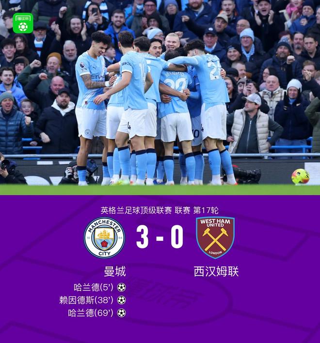 北京时间12月20日,英超联赛第17轮展开较量,曼城坐镇主场迎战西汉姆联。上半场,哈兰德传射建功,赖因德斯小角度劲射破门扩大领先;下半场,西汉姆联攻势一度有起色,鲍恩屡造威胁,但哈兰德抽射破门锁定胜局。最终,曼城主场3-0完胜西汉姆联,先赛一场暂登英超榜首。